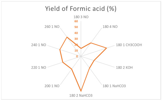 The yield of formic acid production (Figure 15) is highly influenced by high temperatures and the use of catalysts, obtaining the best results under the conditions of 180 °C, 2 h, and NaHCO3 as a catalyst. Good yields are also achieved using CH3COOH as a catalyst at 180 °C or at 260 °C without a catalyst. It is suggested then, in order to achieve a good yield of formic acid, to use weak acids or bases as catalysts for the process for longer times, or, in the case of the use of only water, higher conditions of HTC favor the degradation of other PC to formic acid.