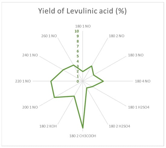Levulinic acid’s optimal conditions for production are reported in Figure 16. The use of weak acid catalysts and longer reaction times (2 h) favor the formation of levulinic acid remarkably. Temperatures over 200 °C but under 260 °C also produce high yields of levulinic acid without the need for catalysts, with 200 °C being the best condition. At temperatures above 260 °C, the acid starts to degrade into smaller molecules, decreasing the yield.