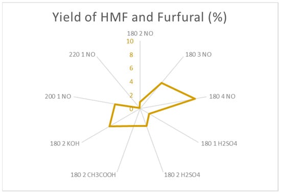 Figure 14 shows the optimal conditions for the production of sugars from pea pod waste. It shows that even though the concentration of sugars obtained is the highest using H2SO4 as a catalyst, the amount of liquid phase obtained at 180 °C for 1 h without catalyst is greater, making the yield bigger as well. At higher temperatures and longer reaction times, the sugars react to produce the other PC or undergo degradation, which makes the yield decrease. The best conditions would then be at 180 °C for one hour with H2SO4 as a catalyst or without it. If the process is meant to be cleaner, then it is suggested to not implement the catalyst, as a good yield is obtained without its use.