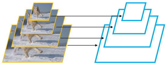 The visual clue guidance module serves two primary purposes. Firstly, it captures multiple visually relevant objects associated with the text in a mutually aligned text–image pair, thereby enhancing the semantic knowledge for information extraction. Secondly, global image features often encompass abstract conceptual information, providing the model with a weak learning signal. In light of this fact, we aggregate various visual clues to strengthen the recognition of multimodal named entities. This strategy not only incorporates local region features as crucial clues but also introduces the global image as auxiliary information. Therefore, as illustrated in Section 3.3.2, we employed the aforementioned strategy to extract image features in this study. In computer vision research, the fusion strategy of features from different blocks, implemented through pretrained models [21,22,23], has been proven as an effective method to enhance model performances. To fully leverage these research findings, we particularly focus on exploring the potential of applying feature pyramids in multimodal scenarios. For this purpose, we propose embedding layered image features in each Transformer layer. Initially, encoding the image based on the above strategy generates a collection of pyramid feature maps at different scales , as shown in Figure 5.