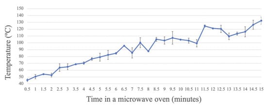 The temperature of the glass bottle was measured with an infrared thermometer (Helect, Shenzhen, China) every 10 s during the sterilization cycle, as an indicative measure of the degrees reached inside the microwave oven.