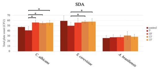 For both yeasts (i.e., C. albicans and S. cerevisiae), increased growth was observed with longer exposure times in the microwave oven, possibly due to their tolerance to pH variations []. On the other hand, the growth of A. brasiliensis in SDA was very similar in all conditions assayed. Growth in regard to SDA sterilized with this system deserves further research, as increased productivity could speed up detection in microbiological controls, food, and medicinal products that are characterized as requiring prolonged periods of incubation.