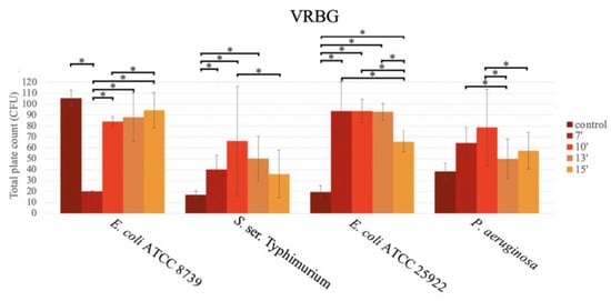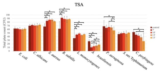 Finally, as expected, complete destruction was obtained for E. coli ATCC 8739 with an exposure time of 4 min, in agreement with previous studies []. It should be noted that, according to our experience, Pseudomonas could also be found in dehydrated media. Therefore, the inclusion of this bacteria in future microbial destruction studies would be of interest.