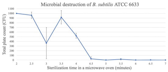 The bacterial strain Escherichia coli ATCC 8739 was obtained from slant tubes (RPD S.L.). Spores from Bacillus subtilis ATCC 6633 were obtained after a thermal shock at 80 °C for 10 min after 7-day cultures (maintained at 32.5 ± 2.5°C) and Geobacillus stearothermophilus ATCC 7953 spores were taken from ampoules (Sterikon® plus bioindicator, MERCK, Rahway, NJ, USA). Then, 50 μL of suspension containing 106 CFU/mL bacteria or spores was injected into a test bottle (5 × 104/bottle), which was exposed to a microwave at a power of 1000 W for periods of time ranging from 2.5 min to 20 min (depending on the destruction of each strain), with measurements taken every 30 s. The suspension was then cooled and poured into a sterile Petri dish and left to solidify. After incubation at 32.5 ± 2.5 °C for 48 h (E. coli ATCC 8739 and B. subtilis ATCC 6633) and 56 ± 2.5 °C (G. stearothermophilus ATCC 7953), the number of colonies was obtained. These tests were performed in triplicate.