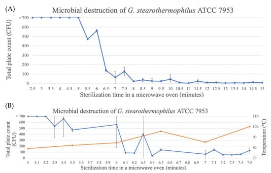 Destruction of G. stearothermophilus spores in TSA through microwave exposure at 1000 W over time (performed in triplicate, UFC count per bottle). (A) Full assay for the complete destruction period. (B) Assay of the destruction period between 5 and 7.5 min being the blue line the CFU count and the orange line the temperature (°C).