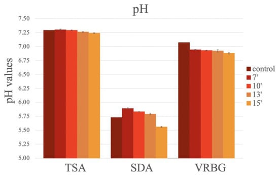 No significant differences in the pH values were observed in the different media, according to the sterilization method or the exposure times (Figure 9). Only a slight decrease in pH value was observed over the exposure times in the microwave oven, with a tendency to acidify the culture medium. For the TSA, similar values were obtained in all media. For the SDA, lower pH values were reported in the autoclaved media and in the media exposed for 15 min in the microwave oven. For the VRBG, higher pH values were obtained in the autoclaved media, and similar pH values were observed in all microwaved media (Figure 9).