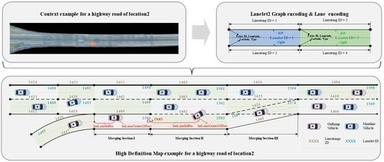 The methodology and framework for trajectory extraction based on HD maps is depicted in Figure 2, focusing on location 2 as a case study. This approach is applied consistently across different collection locations, despite variations in laneletId and laneletLength. Firstly, the stereo images of location sites are displayed as background images in the editor. Secondly, the ‘Linestring’ and the ‘Lanelet number’ in Lanelet2 are used as the basis for manual annotation to establish a relational sequence of merging road segments. Finally, the membership information of the lanes upstream of the lanelet are matched with the ‘odrRoadId’ in the tracks files to manually label the vehicles with the typical pattern in which they are classified.