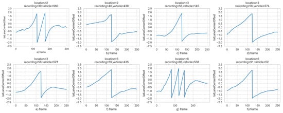 - Selecting the vehicle driving data at the moment of ‘laneChange’ = 1, ‘latLan-eCenterOffset’ ≈ laneWidth/2.