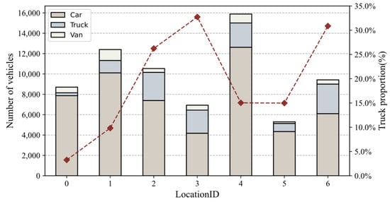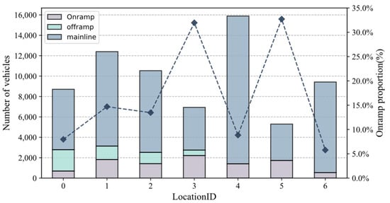 Through the single-frame images in Figure 1, we can gain a brief understanding of the conditions at seven locations. Seven collection locations are similar, but they differ in terms of road conditions, mainly the number of lanes and the presence of diversion sections. There are two consecutive merging at location0. There is an intertwined area at Location 1. There is not a lane reduction working condition at Location 4, which leads to differences in vehicle driving behaviors. Therefore, this paper selects the vehicles collected in Locations 2, 3, 5, and 6. It will be studied in future articles for special consideration.