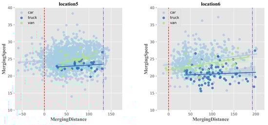 As the merging position moves forward, the higher the vehicle merging speed. The car’s trend line is at the top, located on the upper left; the truck’s trend line is at the bottom, located on the lower right; and the van’s trend line is in the middle, between the car and truck.