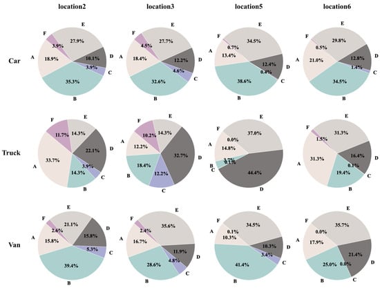 The distribution of merging scenarios at four collection sites is shown in Figure 8, with each pie chart representing the distribution of a specific type of vehicle merging scenario at a data collection location. The distribution of merging patterns at four collection sites is shown in Figure 8, with each pie chart representing the distribution of a specific type of vehicle merging pattern at a data collection location. Observations at various locations indicate that cars and vans often prefer to merge when there are vehicles in front but none behind, suggesting that their drivers tend to adopt a conservative merging strategy to minimize potential conflicts with other vehicles. In contrast, truck drivers exhibit a preference for situations where there are no vehicles in front but some behind, possibly due to trucks’ larger mass and braking distance necessitating greater safety margins during merging. Furthermore, aggressive merging behaviors by trucks in certain locations (over 15% in Pattern C and F) reveal that some drivers choose riskier strategies even in high-risk situations. Analyzing the selection of merging patterns reveals how human drivers guide their behavior based on different environmental states, and it highlights the significant impact of social preferences in the decision-making process. These findings are crucial for enhancing decision-making designs in autonomous vehicles to match the level of human drivers.