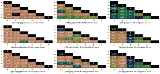 Then, we observe whether there is a significant difference between merging patterns, and then, we measure the variability between the scenarios. We focused on the three variables for driving behavior: merging speed, merging distance, and merging duration. The results of the KS test for different merging patterns feature variables are shown in Figure 9. The merging speed’s KS-test p-values of car, truck, and van in Pattern B and E are 0.92, 0.12, and 0.39 (all > 0.05). The original hypothesis cannot be rejected. There is no significant difference between merging speeds in Pattern B and E. When a vehicle exists ahead in the target lane, the presence or absence of a RV has no significant effect on the merging speed of drivers. When testing the merging speed of autonomous vehicles, patterns B and E can be divided into one scenario for simulation testing.