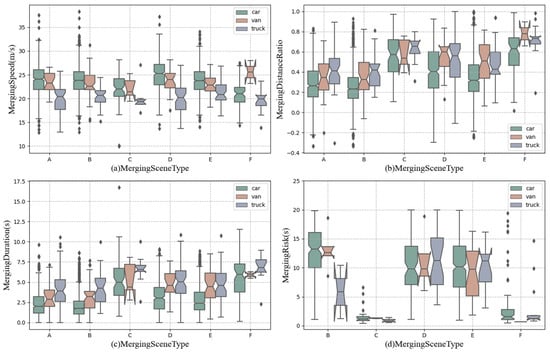 The box plots in Figure 10 illustrate the statistical differences among the various vehicle types. Notably, when it comes to merging, distinct variations can be observed across different vehicle categories. The merging speeds of trucks are the lowest among various merging patterns, with an average speed of approximately 20 m/s. The ego vehicle in Patterns C or F merges relatively slowly compared to other merging patterns. In other words, the ego vehicle’s speed is lower at the crucial merging phase as it follows alongside vehicle. When the target lane experiences free-flowing traffic, there is an observed hierarchy in terms of merging speed: car > van > truck; merging distance: truck > van > car; and merging duration: truck > van > car.