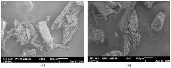 Pineapple is a typical example of a tropical fruit. The peels of this fruit are mostly utilized for animal feeding and the production of organic compost. However, the crown lacks specific applications and is frequently discarded in landfills as waste material []. The primary challenge associated with incorporating pineapple crowns into concrete lies in the extraction process, specifically in effectively removing impurities from the fibers []. Therefore, surface treatment of the pineapple crown has been identified as a helpful method in order to eliminate non-cellulosic compounds []. Based on the literature, it was found that one of the best treatments for removing hemicelluloses and lignin is the use of NaOH in the compound. Nevertheless, when applying alkaline treatment to the surface of agricultural fibers, environmental concerns cannot be ignored []. In addition to these environmental issues, this treatment is very costly. Figure 2 shows SEM images of both treated and natural pineapple crowns. As seen in this figure, alkaline treatment increases surface wrinkling and improves the adhesion between the cement and the fibers. Similar results were obtained when incorporating natural agro-waste like coconut fibers into mortar and concrete [,]. In one study, de Araujo Alves Lima et al. tested dual-hybrid fibers of jute, sisal, curauá, and ramie, and they emphasized that chemical treatment alters the morphological properties of jute fibers []. The researchers concluded that the optimal treatment varies based on the fiber type, noting that alkaline treatment improved the tensile attributes of a significant portion of the fibers, while a combination of alkalization and salinization treatments was more effective for the sisal fiber.