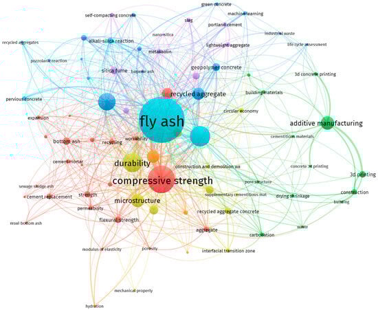 Network map of keywords that have been used in published papers about additives used in concrete and cement, obtained from Web of Science.