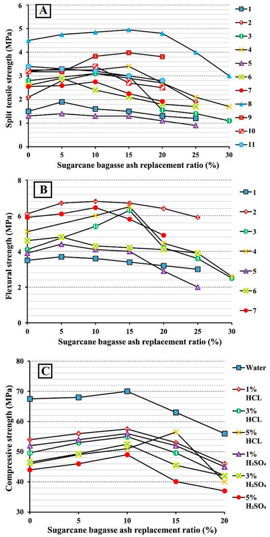 Impacts of sugarcane ash on split tensile strength, flexural strength, and compressive strength (in acidic environments) at 28 days (results obtained from a comparison of 11 experimental papers) []. Ahmed et al. [] plotted each line of Figure 4 (A) using the data obtained from (1) [], (2) [], (3) and (4) [], (5) [], (6) [], (7) [], (8) [], (9) [], (10) [], (11) []; (B) using the data obtained from (1) [], (2) [], (3) and (4) [], (5) [], (6) [], (7) []; and (C) using the data obtained from [].
