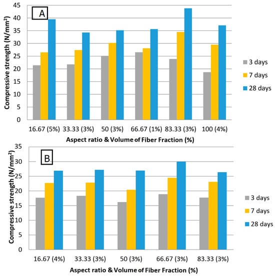 Conventional concrete mixed with fibers (A) and proposed coconut shell concrete with fibers (B): compressive strength with respect to aspect ratio and volume portion (%) [].