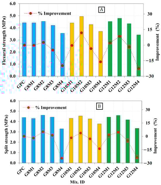 Improvement in (A) flexural and (B) split tensile strengths after 28 days. GPS stands for geopolymer concrete; G8, G10, and G12 stand for geopolymer concrete with ground/granulated blast furnace slag at molar ratios of 8, 10, and 12, respectively; M1, M2, M3, and M4 stand for 0%, 10%, 20%, and 30% micronized rice husk silica, respectively [].