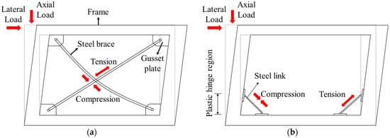 - Zhuang, L.; Wang, J.; Nie, X.; Wu, Z. Experimental study on seismic behaviour of eccentrically braced composite frame with vertical LYP steel shear link. Eng. Struct. 2022, 255, 113957. [Google Scholar] [CrossRef]