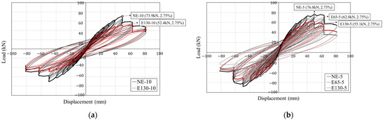 - The RSL system exhibited significant control over crack propagation in reinforced concrete columns. Initial flexural cracks were observed at a drift ratio of 0.75% in all specimens. Under eccentric loading, specimens with a 5 mm sliding slot length showed shear cracks at a drift ratio of 1.75%. In comparison, specimens with a 10 mm sliding slot length exhibited shear cracks at a drift ratio of 1%. These findings indicate that the sliding slot length plays a crucial role in crack propagation. After the experiment concluded, the damaged steel link could be easily replaced, thus confirming the feasibility of using the RSL system as a structural fuse.
