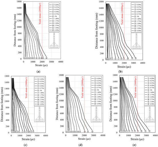 - The maximum load capacities exhibited variations based on sliding slot length and eccentric distance. An increase in eccentric distance resulted in a 70 to 80% change in maximum load capacity, while the variation in maximum load due to sliding slot length at the same drift ratio was around 10%. This finding underscores the RSL system’s capability to effectively resist torsion. Specimens with a 5 mm slot reached their yield strain earlier and showed a higher strain compared to those with a 10 mm slot. This result was in line with the initial design expectations, demonstrating that adjustment of the sliding slot length can be an effective method to regulate the yielding behavior of a steel link.