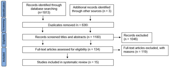 Using the search strategy outlined above, we identified a total of 1813 studies in the databases, as well as three additional records identified through other sources, which was via the reference lists of the initial papers that were retrieved. Of these 1816 items, 636 were duplicated records. The remaining 1180 studies were evaluated by title and abstract by two independent reviewers (G.B. and L.R.P.). Of these, 1046 were excluded due to differences in inclusion criteria as they were studies based on surgery, systematic reviews and meta-analyses, cadaver studies, studies focused on the spring ligament, complete tendon rupture, dislocation, or trauma to the bone, and papers focused on medication treatment and diagnostics. After that, 134 full texts were assessed for eligibility and 119 were excluded because they were protocols, letters to editor, participants were under 18 years of age, participants were not diagnosed with PTTD, participants presented with congenital deformity or some systemic disease, studies which describe the assessments used to aid in surgical treatment of PTTD, or studies focused on assessments used for research purposes to describe the condition. Thus, only fifteen papers fully met the inclusion criteria. Figure 1 shows the PRISMA flow diagram for the studies included in this review.