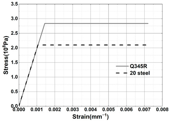 The structure analyzed in this paper was composed of a cylinder and a tangential nozzle. The cylinder material was Q345R with a yield strength of 283.5 MPa, and the nozzle material was 20# steel with a yield strength of 210 MPa [14]. According to GB150.2-2011 [15], the material performance parameters are shown in Table 1.