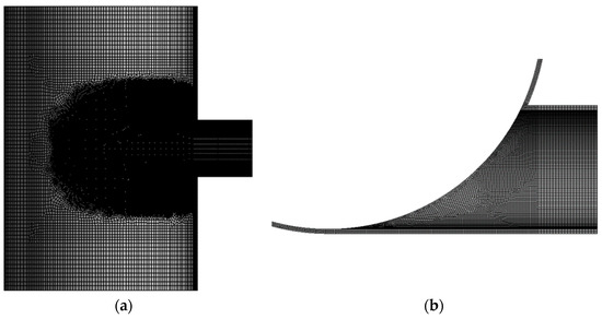 The limit–load analysis is a material nonlinear problem. Considering that the structure of the connection part of the tangential nozzle is discontinuous and even sharp changes occur, in order to ensure the stability of the numerical solution, the meshing requirements are higher. Here, the three-dimensional solid high-order element (solid186) provided by ANSYS Workbench 2021 R1 software was used for meshing. At the same time, local mesh refinement was performed in the connection area of the tangential nozzle and the cylinder to improve the accuracy of the calculation results. The mesh model is shown in Figure 3. For the model with do/Di = 0.3, t/T = 1 and Di/T = 100, the total number of elements is 235,805, and the total number of nodes was 1,089,252.
