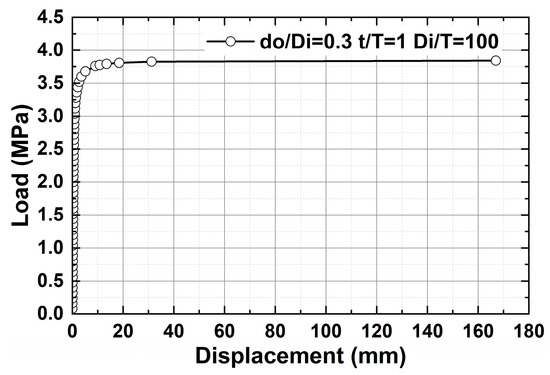 Displacement–load curve of the cylindrical shell with a tangential nozzle for limit–load analysis (do/Di = 0.3, t/T = 1, Di/T = 100).