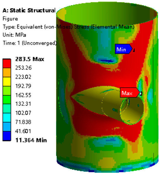 The limit load for a cylindrical shell without a nozzle is primarily determined by the maximum pressure exerted on the shell. This critical load depends not only on the material strength but also on the diameter and thickness of the shell. It can be derived from analyzing the von Mises stress or the circumferential stress induced by internal pressure. Through the finite element calculation, the limit load of four groups of cylindrical shell models without nozzles is obtained as listed in Table 3, and the von Mises stress value in the limit state is also listed in the table [18]. It can be seen that the von Mises stresses are very close to the yield strength of the model with a relative error of less than 2%, indicating that the limit–load calculation is accurate.