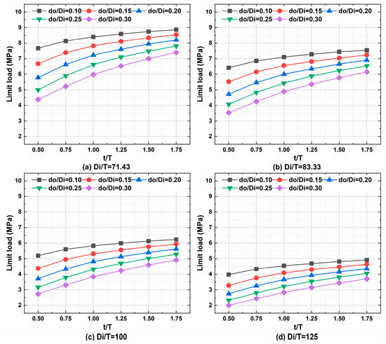 Figure 7 shows the variation in the limit load of the cylindrical shell having a tangential nozzle with the structural parameters. Obviously, in the range of the designed parameters, with the increase in Di/T, the limit–load value decreases significantly. Keeping Di/T unchanged, with the increase in t/T and the decrease in do/Di, or in other words, the larger the wall thickness and the smaller the outer diameter of the tangential nozzle, the greater the limit load of the cylindrical shell with the tangential nozzle or the stronger the bearing capacity of the structure is, as a result of a less weakening degree of the tangential nozzle on the strength of the cylindrical shell.