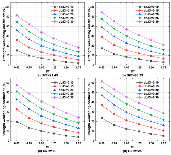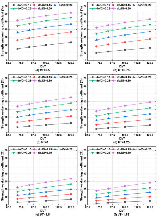 In the formula, P0 and P are the limit load of the cylindrical shell without a nozzle and the cylindrical shell with a tangential nozzle, respectively. Obviously, the greater the strength–weakening coefficient, the greater the influence of the tangential nozzle on the load-bearing capacity of the cylindrical shell. The strength–weakening coefficient of the cylindrical shell having tangential nozzles with different diameter ratios do/Di, thickness ratios t/T and diameter-thickness ratios Di/T under internal pressure is shown in Figure 8, Figure 9 and Figure 10.