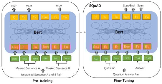 The internal structure of the BERT model utilizes the encoder part of the Transformer model, with multiple layers stacked together. The output of the BERT model is a vector for each input token. In the fine-tuning stage, the BERT model can be applied to various downstream tasks by utilizing its one-to-one input–output features. For example, in a sentence pair classification task, the output corresponding to the input’s first token can be used for classification. In a named entity recognition (NER) task, the output for each word can represent its position (beginning, middle, or end). In the SQuAD task, the model can output the probabilities for the start and end positions of an answer. Thus, the BERT model can be applied to a wide range of downstream tasks [].