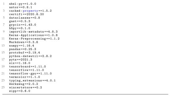 Step ①: Obtain the dependent Python libraries and their versions from the local Desktop. This can be done by running the command “pip freeze > requirements.txt”, which generates a file containing the names of all the Python libraries. The required Python libraries and their versions for the BERT model are shown in Figure 4.