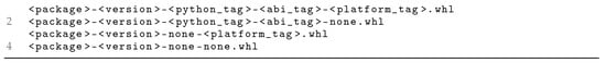 Step ②: Check the supported formats of the .whl files by pip on Phytium 2000+. The wheel file formats are shown in Figure 5. Note that <package>, <version>, <python_tag>, <abi_tag>, and <platform_tag> will be replaced with the actual package name, version, Python tag, ABI tag, and platform tag, respectively, for each specific package. The supported formats on Phytium 2000+ are shown in Figure 6.