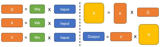 An attention function can be described as mapping a query and a set of key–value pairs to an output, where the query, keys, values, and output are all vectors []. The attention mechanism in the multi-head self-attention layer can be represented in Equation (1):