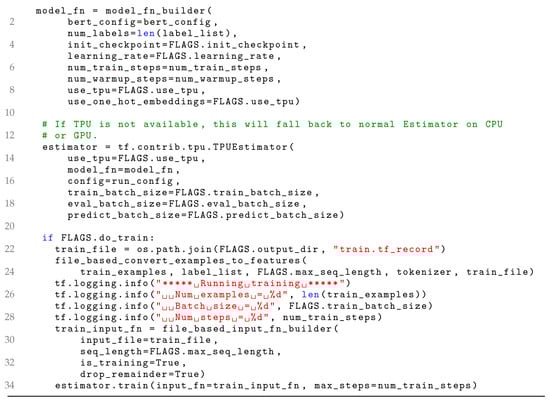Our focus is on the fine-tuning of the BERT model, specifically the “run_classifier.py” file, where the model training and evaluation are performed using tf.estimator. Figure 9 shows the model construction, where the model_fn_builder function, previously defined, is called, and it returns another function, model_fn. This model_fn function defines the computational graph of the model and specifies the operations to be performed during training, evaluation, and prediction. The model_fn is then used to create an estimator instance. The original code uses the tf.contrib.tpu.TPUEstimator function, but since we are using multi-core CPUs, we need to replace it with tf.estimator.Estimator. The file_based_fn_builder function is then called, which returns train_input_fn of type tf.data.Dataset. Finally, we call estimator.train to train the model.