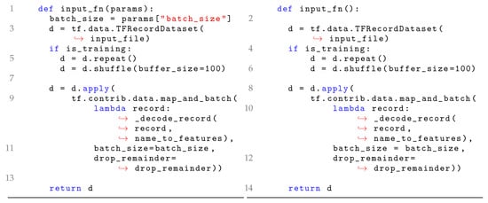 In the original BERT code, the batch size in the input_fn function is directly read from the params parameter, as shown in Figure 11. This is because the original code passes the batch_size as a parameter to the estimator. However, our modified estimator in Figure 10 does not need this parameter. Therefore, we need to make batch_size a parameter of the file_based_input_fn_builder function. The specific modifications are shown in Figure 11. When calling this function, we also need to pass the batch_size as a parameter. When performing evaluation and prediction, we have to pass the corresponding batch_size as well.