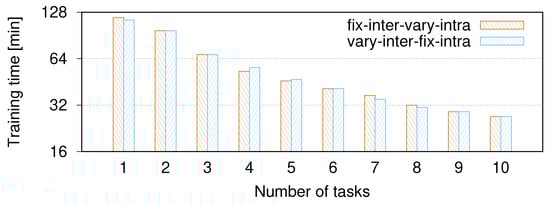 This section shows the performance obtained by varying inter/intra-thread numbers while fixing the other. The experiments are run with the RTE dataset, and the maximum number of CPU cores used is set to 10. The performance results in terms of training time are shown in Figure 12. We see that increasing the intra- or inter-thread numbers appropriately leads to a shorter training duration while fixing the other.