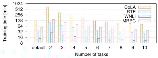 Based on these findings, we further evaluate the performance impact of using different numbers of CPUs, which equals the inter/intra-thread number on training time. In these experiments, we set the inter/intra-thread numbers to be equal to the number of CPU cores, i.e., each thread is bound to a CPU core. As a matter of fact, we also conduct experiments including running multiple threads on a CPU core, but we fail to achieve any performance improvement. We vary the number of CPU cores from 1 to 10, and the performance results are shown in Figure 13. Additionally, we also measured the training time based on the original BERT model, which is represented as “default” in the figure. We see that when the number of CPU cores increases, the training time shows a nonlinear reduction. This observation aligns with our experimental experience. In the original BERT model, the inter_op_parallelism_threads and intra_op_parallelism_threads were not explicitly set to specify the granularity of CPU parallelism. Under these circumstances, TensorFlow attempts to automatically utilize multi-core CPUs to accelerate computation. However, as our experimental results have demonstrated, TensorFlow’s automatic settings do not achieve optimal performance. To minimize training time to the greatest extent, it is advisable to manually set parameters to optimize TensorFlow’s parallelism according to requirements. When using more CPU cores, the overhead from the inter-core communication will gradually increase, leading to a diminishing reduction in training time. Therefore, selecting the right number of threads is the key to reducing training time.