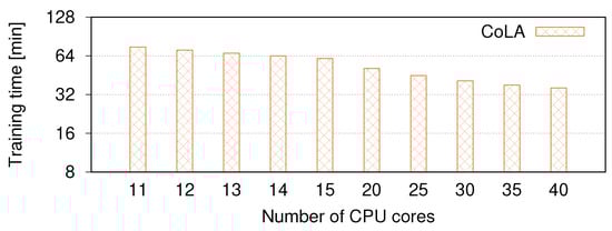 To further investigate the performance impact of using more CPU cores on training time, we run additional experiments on the CoLA dataset. Here, we increase the number of CPU cores and keep the number of CPU cores equal to the number of inter and intra threads. The performance results are shown in Figure 14. We see that using more CPU cores can lead to a further reduction in training time, but the performance gain will become minor.
