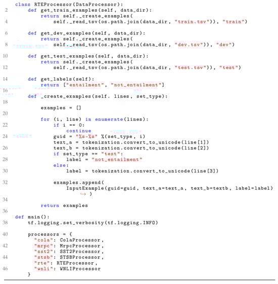 To achieve fine-tuning of the pretrained BERT model on downstream tasks, we have to modify the code file run_classifier.py. In this context, we will use the RTE dataset as an example to illustrate the basic steps of fine-tuning BERT.