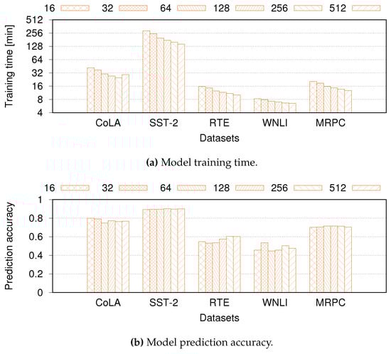 In Figure 16a, we see that, as the batch size increases, the training time significantly decreases. This particularly holds for tasks with large datasets, such as CoLA and SST-2. In terms of prediction accuracy, we see that the impact of batch size on prediction accuracy is uncertain, as shown in Figure 16b. For the CoLA dataset, increasing the batch size results in a slight decrease in accuracy, which aligns with our previous analysis that using a larger batch size requires more epochs to achieve the same level of accuracy. Subsequent experiments also confirm that increasing the number of epochs can compensate for the accuracy loss caused by larger batch sizes. On the other hand, for datasets like RTE, WNLI, and MRPC, increasing the batch size leads to a slight improvement in accuracy. This is due to the fact that using larger batch sizes can better represent the direction of gradient descent for the dataset, increasing the likelihood of finding the optimal point.