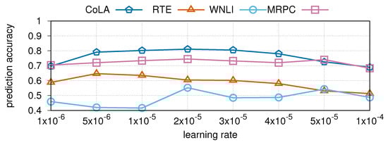 Based on the aforementioned analysis, we evaluate the performance impact of learning rates on different datasets. We set initial learning rates to be 1 × 10−6, 5 × , 1 × , 2 × , 3 × , 4 × , 5 × , and 1 × . Here, we use the Adam optimizer to update the learning rate dynamically. We then evaluate the performance impact of the learning rate on model accuracy for downstream tasks. The results are shown in Figure 17. We see that, for most of the downstream tasks (i.e., CoLA, RTE, WNLI, and MRPC), setting the initial learning rate around 2 × leads to better prediction accuracy.