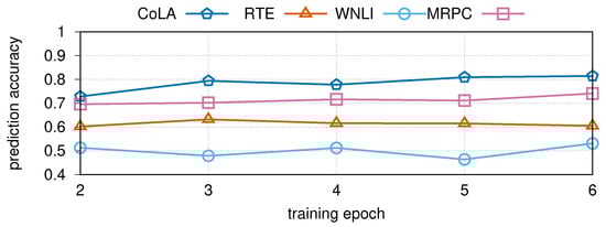 Based on this analysis, we evaluate the performance impact of the number of epochs for different downstream tasks of the BERT model. We measure the performance of various epoch values (e.g., 2, 3, 4, 5, and 6) to assess their impact on the accuracy of the downstream tasks. The performance results are shown in Figure 18. We see that, for the vast majority of datasets, the prediction accuracy continuously improves with the increase in epoch. We also note that there are a few datasets (such as RTE) that achieve the best prediction accuracy when the epoch is 3. As the epoch continues to increase from 3, the accuracy of the training set continuously improves, but the prediction accuracy of the test set decreases, indicating a model overfitting. Therefore, using the right number of training epochs can help us obtain a better model.
