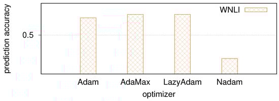 When training the BERT model on multi-core CPUs, we chose to use the Adam optimizer. Since the introduction of Adam, researchers have proposed various improved versions. These enhanced versions aim to address certain limitations of the original Adam algorithm, such as increasing stability, accelerating convergence, or improving the final model’s performance. We selected three variants of Adam for experimentation, including AdaMax [], LazyAdam [], and Nadam [],to identify the most suitable optimizer for training the BERT model on multi-core CPUs. The experiments are run using the WNLI dataset, applying the default configuration parameters for each Adam variant, and the results are compared with Adam’s optimal accuracy. As shown in Figure 19, the models trained using AdaMax and LazyAdam optimizers can achieve better accuracy than Adam. Nadam looks to be unsuitable for BERT model training, yielding the worst accuracy.