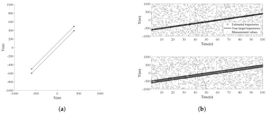 where 100 m, 450 m, 0 m/s, 0 m/s, [−450 m, −450 m, 0 m/s, 0 m/s, 450 m, −209 m, 0 m/s, 0 m/s, [−350 m, −350 m, 0 m/s, 0 m/s. Figure 10a shows the real tracks of multiple extended targets in Scenario 3. Figure 10b shows the simulation results of the proposed algorithm.