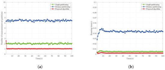 (a) Comparison of the number of measurement set partitions in Scenario 1. (b) Comparison of running time of each algorithm for Scenario 1.