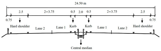 The Yongji test road is a 24 km long mountainous freeway with two lanes in each direction and numerous small-radius curves. A cross-sectional view of the road is illustrated in Figure 1. The road’s blueprinted longitudinal grade varies from −6.0% to +4.0%, and it has a cross-section width of 10.50 m (including a 0.5 m wide curb, 3.75 m wide lanes, and 2.50 m wide shoulders).