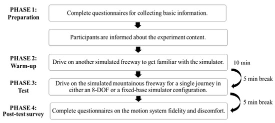 The experiment comprises three phases: preparation, warm-up, and testing. The experimental procedure is depicted in Figure 4. During the preparation phase, the participants first answered a questionnaire about their demographic and driving experience. Participants were briefed on the study’s purpose, the simulated driving task’s nature, and potential risks. During the warm-up phase, they drove for approximately ten minutes on a typical freeway without mountains to familiarize themselves with the simulator. Following a five-minute break, they proceeded to the test phase, where each participant drove on the fully simulated Yongji Freeway. After finishing, each participant took a 5 min break and filled out the simulated dizziness questionnaire. Following that, they proceeded to drive in the opposite direction.